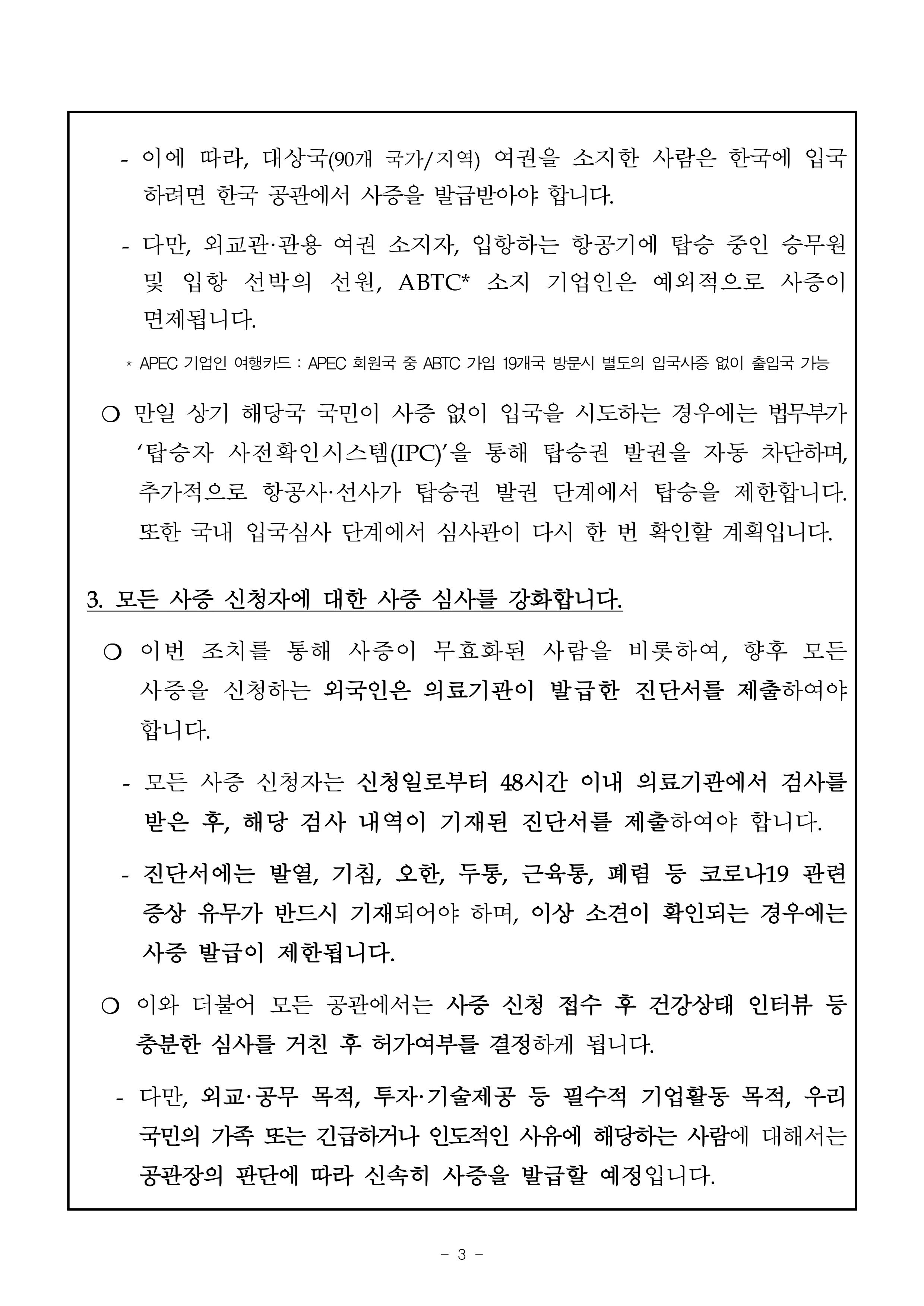 ❍ 대한민국 국민에 대하여 입국금지 조치를 취한 국가/지역(151개) 중, 우리나라와 사증면제협정을 체결하였거나 우리 정부가 무사증입국을 허용한 국가/지역(90개)에 대한 사증면제 조치를 잠정적으로 정지합니다. ※ 사증면제협정·무사증입국 잠정 정지 대상: 90개 국가/지역(협정 체결 56개, 무사증입국 허용: 34개) (4.8. 기준, 세부사항 붙임 참조) – 이에 따라, 대상국(90개 국가/지역) 여권을 소지한 사람은 한국에 입국하려면 한국 공관에서 사증을 발급받아야 합니다. – 다만, 외교관·관용 여권 소지자, 입항하는 항공기에 탑승 중인 승무원 및 입항 선박의 선원, ABTC* 소지 기업인은 예외적으로 사증이 면제됩니다. * APEC 기업인 여행카드 : APEC 회원국 중 ABTC 가입 19개국 방문시 별도의 입국사증 없이 출입국 가능 ❍ 만일 상기 해당국 국민이 사증 없이 입국을 시도하는 경우에는 법무부가 ‘탑승자 사전확인시스템(IPC)’을 통해 탑승권 발권을 자동 차단하며, 추가적으로 항공사·선사가 탑승권 발권 단계에서 탑승을 제한합니다. 또한 국내 입국심사 단계에서 심사관이 다시 한 번 확인할 계획입니다. |