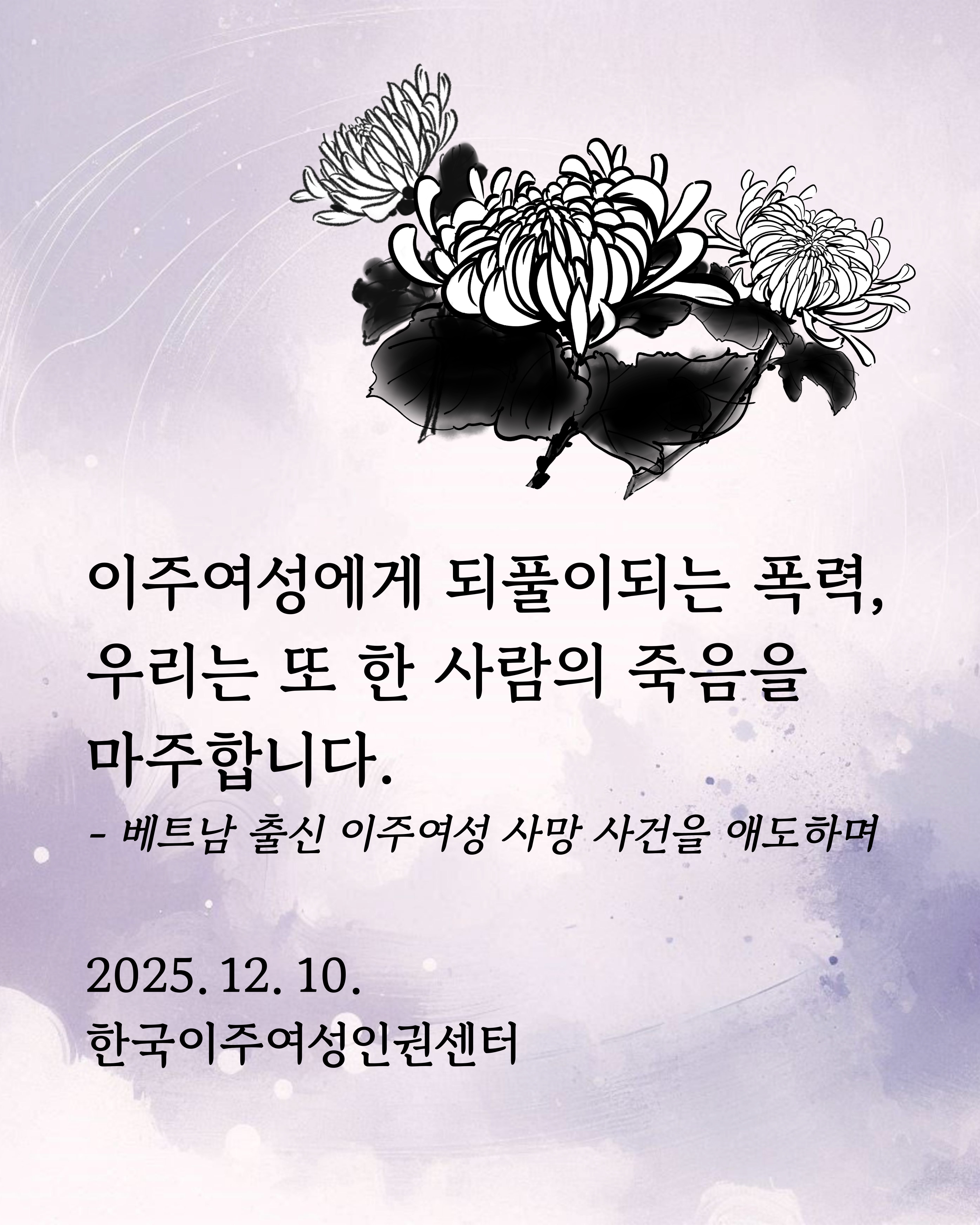 이번 사건은 개인이나 한 가정의 문제가 아니라, 이주여성이 가족과 지역사회, 제도 속에서도 쉽게 고립되는 환경, 그리고 이주여성의 삶을 편견과 제한된 역할로 묶어 온 사회 구조 속에서 발생한 비극입니다. 이러한 취약성이 꾸준히 지적되어 왔음에도 이번 죽음으로 이어졌다는 사실은, 구조적 폭력이 여전히 이주여성의 일상에 자리하고 있음을 보여줍니다.