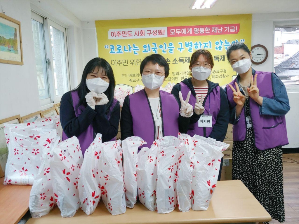 이주민을 위한 마스크 소독제 나누고 있습니다.