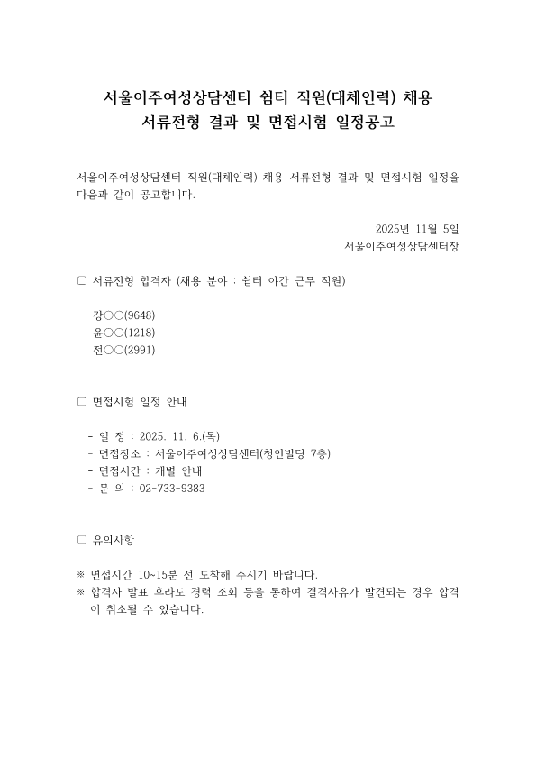 서울이주여성상담센터 쉼터 상담원 채용 서류전형 결과 및 면접시험 일정공고_1