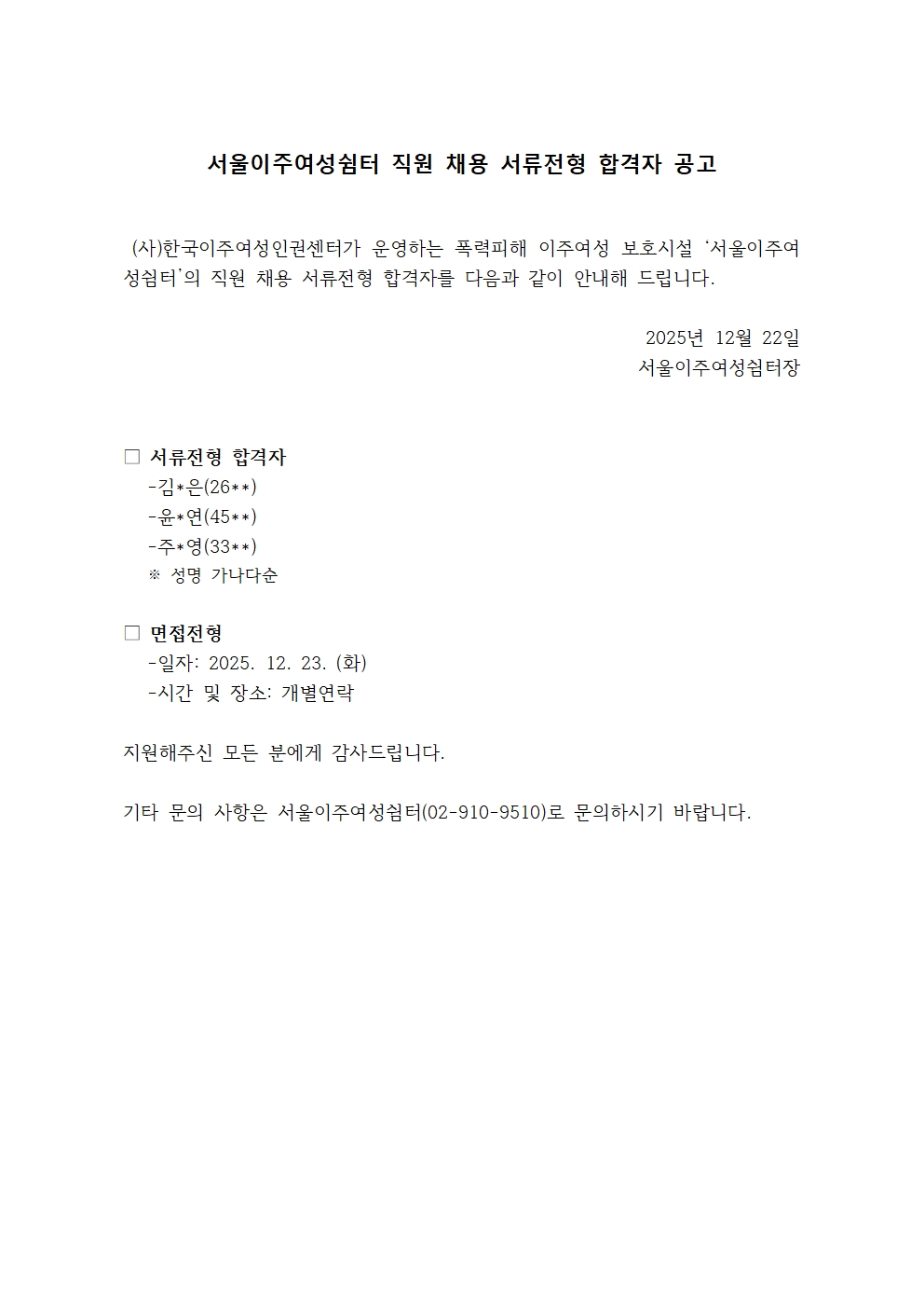 서울이주여성쉼터 직원 채용 서류전형 합격자 공고